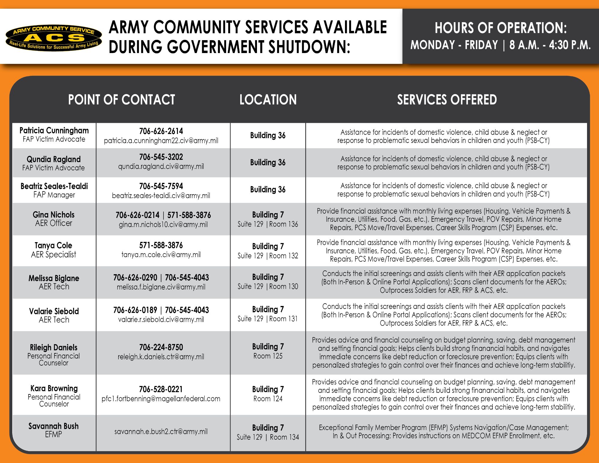 AER has over 35 categories of assistance to support Soldiers and their Families. Talk to your local AER officer to learn more. Call the AER office at +1 (706) 545-0392.