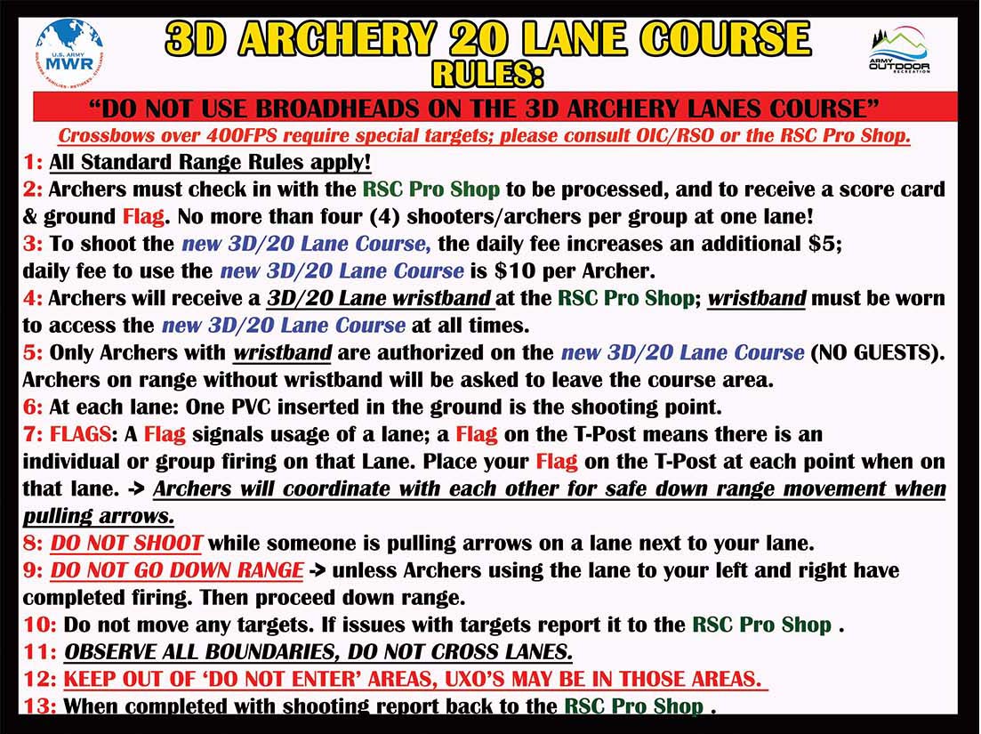 - Daily 3D Archery 20 Lane course pass: $15